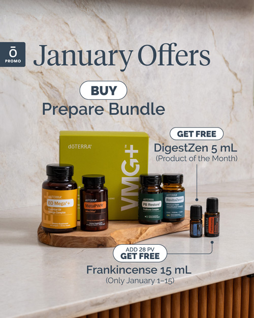 The Foundational Wellness Bundle (125 PV) helps start the year on the right foot by focusing on your core wellness goals. This bundle includes three daily products—VMG+®, EO Mega®+, and doTERRA PB Restore®—that are formulated to support a simple but foundational routine.
